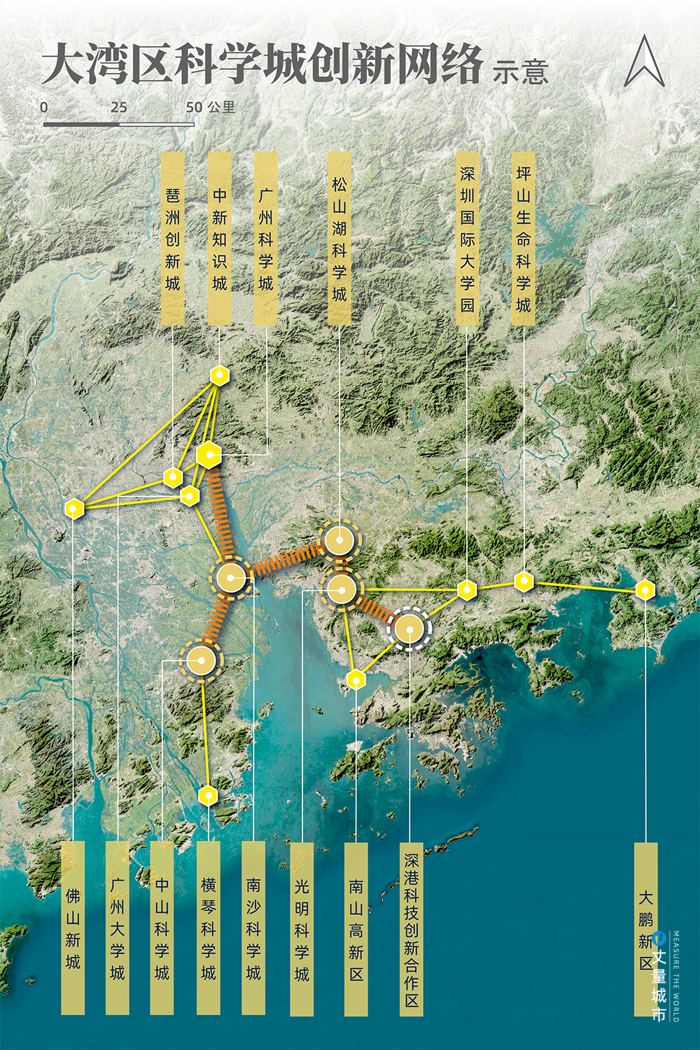 ▼ 大灣區(qū)的科學(xué)城與周邊的創(chuàng)新節(jié)點(diǎn)構(gòu)成創(chuàng)新網(wǎng)絡(luò)