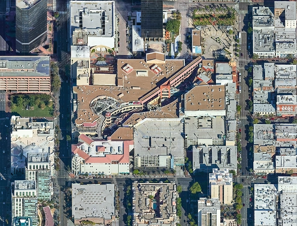 霍頓廣場占據(jù)了城市中心6.5個(gè)街區(qū),建筑面積7萬多平米,由著名的捷得(Jerde)規(guī)劃設(shè)計(jì)公司在1985年設(shè)計(jì)而成。