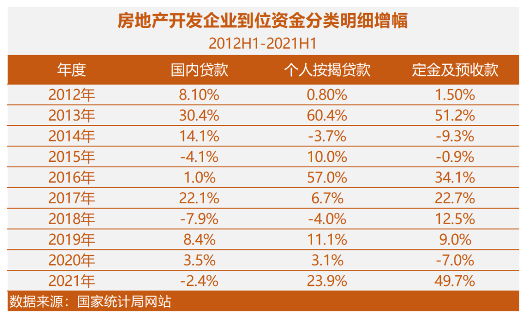 重點看國內(nèi)貸款、定金及預(yù)收款、個人按揭貸款三項的增幅,2012年上半年到2021年上半年這十年的情況如下: