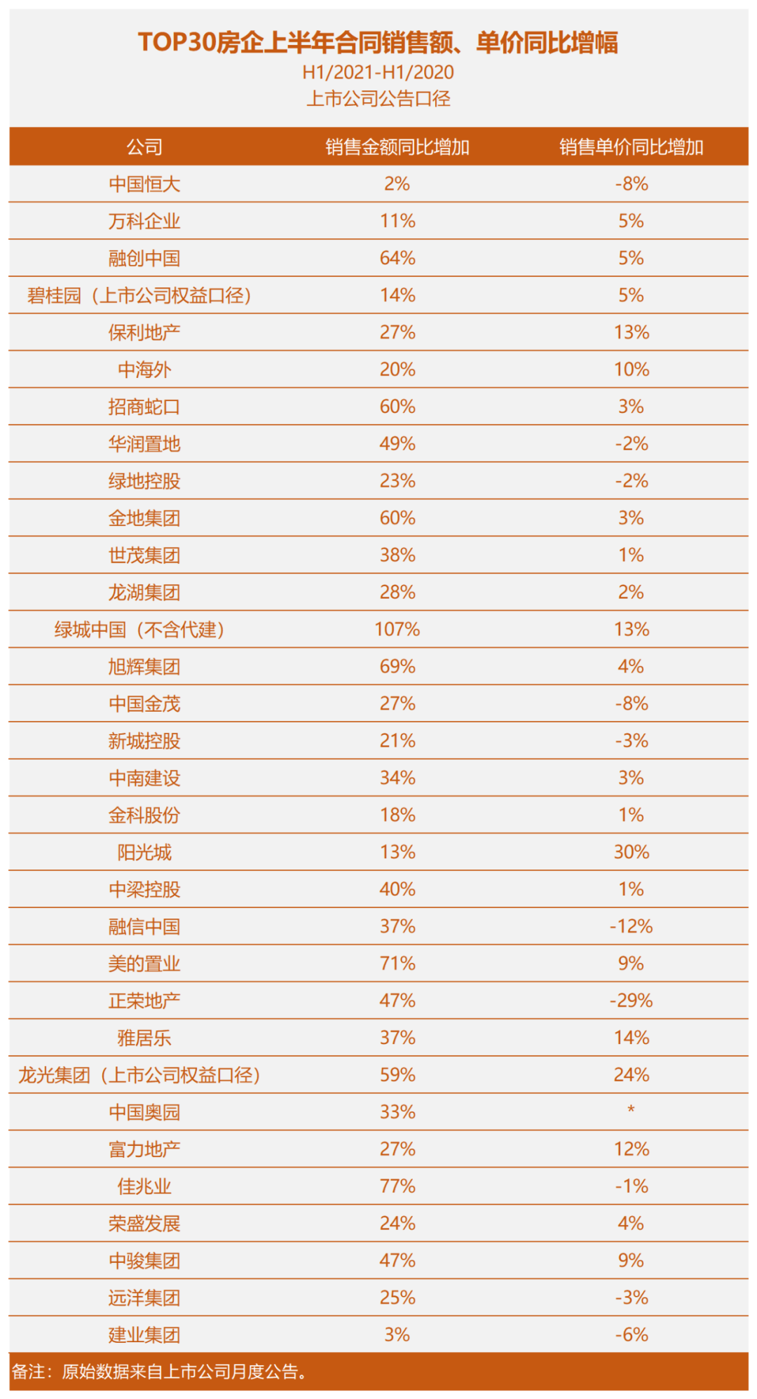 我們用上市房企月度公告口徑,對比了TOP30房企的銷售業(yè)績(2020年上半年與2021年上半年):