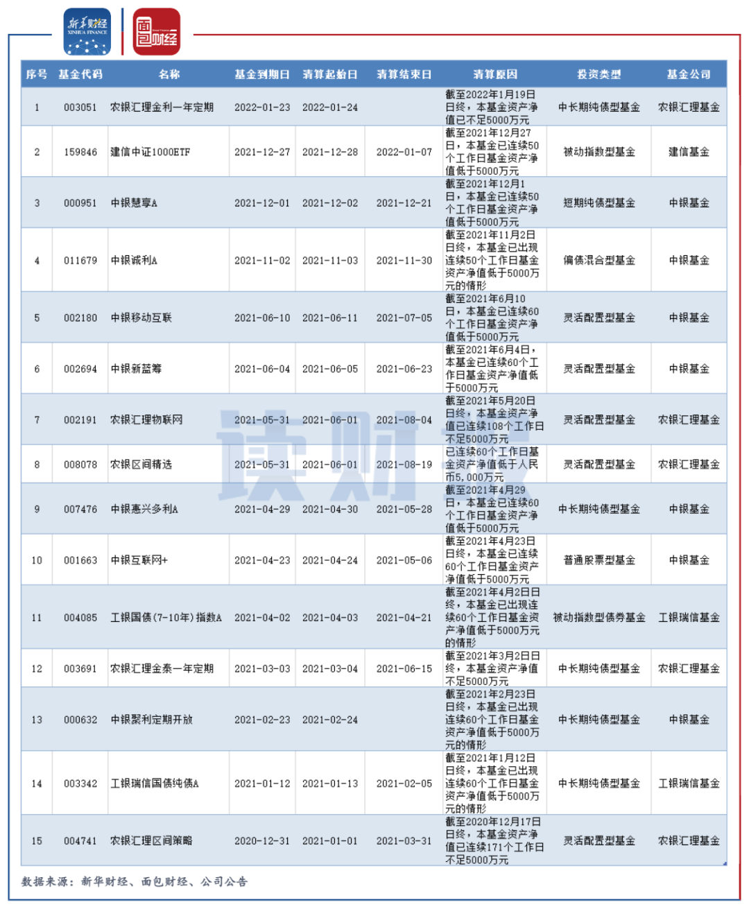 “農銀匯理金利一年定期”近期發布公告稱,截至2022年1月19日日終,該基金資產凈值已不足5000萬元,該情形已觸發《基金合同》中約定的本基金終止條款,自2022年1月24日起進入清算程序。