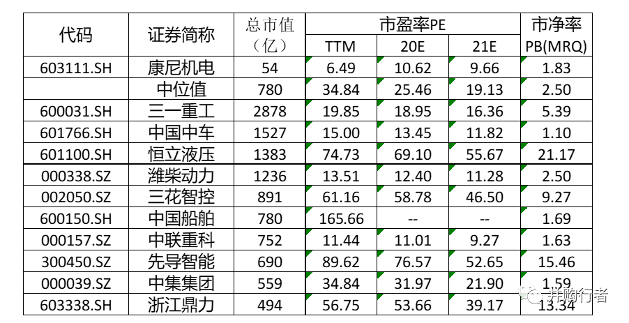 可比機械行業(yè)的企業(yè)估值比較: