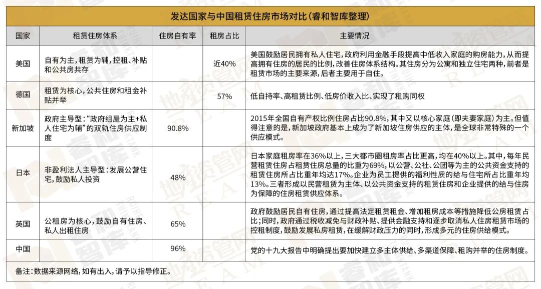 美國、德國、日本、新加坡、英國等發(fā)達國家都擁有比較成熟發(fā)達的住房租賃市場和完善的住房租賃政策。租賃是住房供應的“雙引擎”之一,一般占據(jù)40%~60%的市場份額。其中,新加坡供應模式非常特殊,政府基本上成為了住房供應的主體。