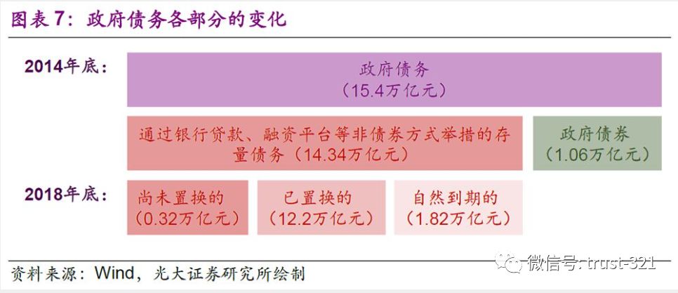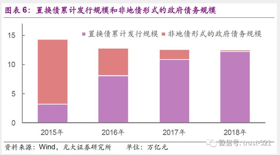 說白了,就是把債權形式變了,以前是借融資平臺貸款,現在變成ZF直接作為債務人的ZF債,給3年時間完成。截止到2018年底,3年時間共發行了12.2萬億元的地方ZF置換債,平均每年3萬億左右,購買者主要是商業銀行為主。