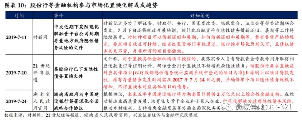 與望梅止渴的國開行相比,6月份以后,國有股份制大行參與化解隱性債務的節奏就在加快。據媒體報道6月20號前后,監管部門已下發防范化解融資平臺公司到期存量地方政府隱性債務風險的意見。但由于文件涉密,至今并未對外公布。不過下半年股份銀行參與置換的節奏確實在加快。