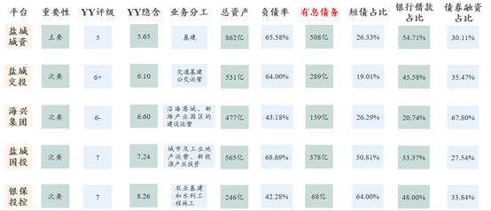鹽城一年的預(yù)算收入不到400億元,基金收入高一點(diǎn)有600億,把地市級(jí)平臺(tái)的有息債務(wù)一拉,鹽城城資500多億,交投289,海興159,鹽城國(guó)投378,銀保68,債務(wù)的絕對(duì)規(guī)模相比于預(yù)算收入,是比較高。