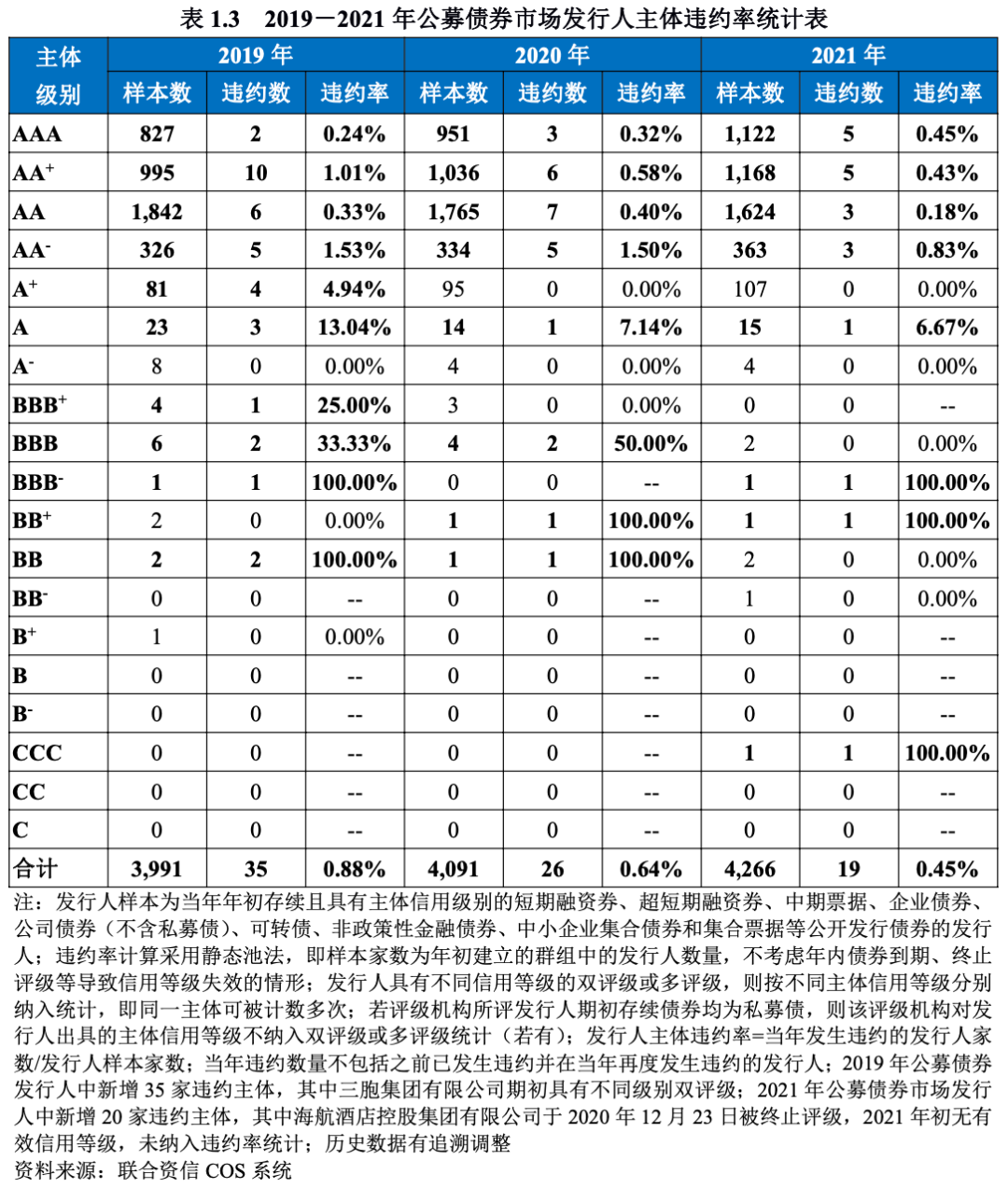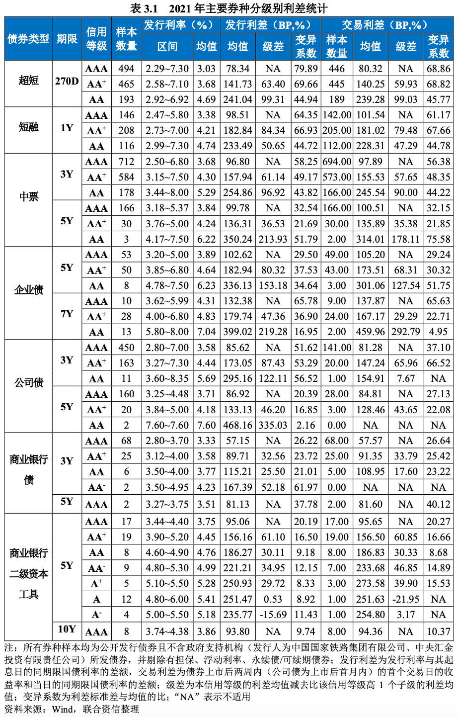 違約情況方面,2021年我國債券市場新增違約發行人23家,主要為海航系企業和部分房地產行業企業及其關聯企業,信用風險有序釋放,年度違約率較2020年和2019年有所下降。等級調整方面,公募債券發行人信用等級調整率較2020年和2019年有所下降,整體呈下調趨勢。信用等級遷移方面,樣本數量較多的AA-級及以上級別整體穩定性較好,AA+級至AA-級穩定性有所上升。利差表現方面,信用等級與債券發行利率均值、利差均值基本呈負向關系,主要券種不同信用等級利差間均存在顯著性差異,從這個角度看,信用評級能夠較好反映發行人信用風險差異。