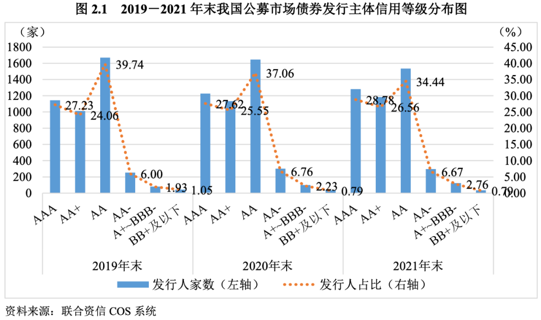 截至2021年末,我國公募債券市場發行主體信用等級仍集中在AA-級及以上級別,占比(96.45%)較2020年末(96.98%)和2019年末(97.03%)均有所下降。其中,AA級發行主體占比仍然最高(34.44%),較2020年末和2019年末分別下降2.62和5.30個百分點;AAA級發行主體占比(28.78%)較2020年末和2019年末分別上升1.16和1.56個百分點,AA+級發行主體占比(26.56%)較2020年末和2019年末分別上升1.01和2.50個百分點;AA-級發行主體占比(6.67%)較2020年末下降0.09個百分點,較2019年末上升0.67個百分點。2021年以來信用等級整體呈調降趨勢,但由于以AA級為主的弱資質主體逐步出清,其占比有所下降,信用等級中樞未呈現明顯下移趨勢。