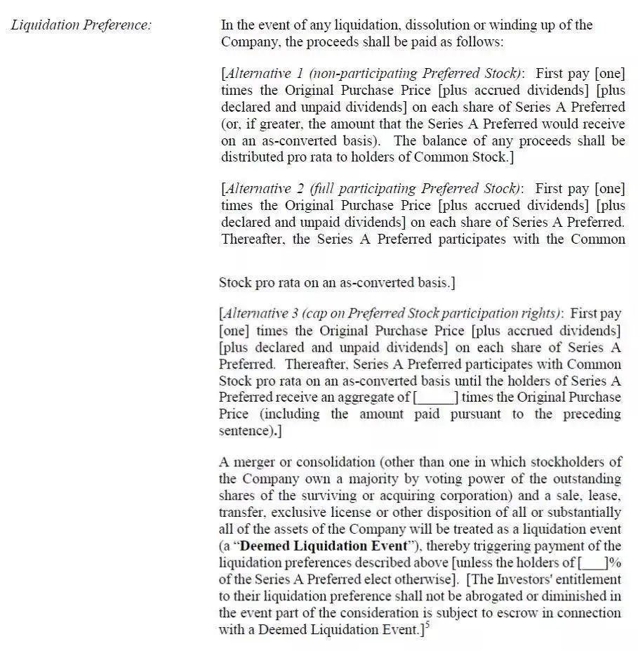 注:美國風險投資協(xié)會制定的范本中,沒有中國本土化優(yōu)先清算權條款細化補充的第二次分配實現(xiàn)方式,即并未有公司全體股東同意清算情形觸發(fā)時公司定向分紅/減資的約定,也未有視同清算情形下股東間通過贈予方式實現(xiàn)優(yōu)先清算權原設計分配效果的約定,可比對上文中文示范文本1.1.3、1.1.4條 。