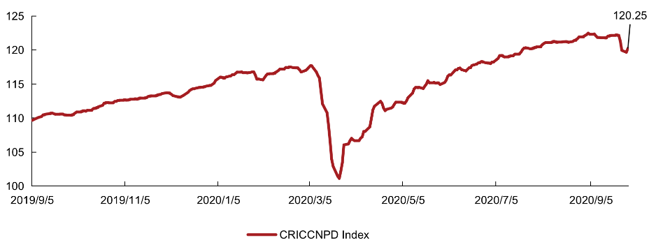 為了更好地展示房企融資的市場表現,克而瑞委托倫敦證券交易所集團(LSEG)的全資子公司:富時羅素經過嚴格篩選,挑選出具有代表性的中資房地產美元債進行編制了克而瑞中國地產債券領先指數。截止至2020年9月29日,該指數相比9月21日高點小幅回調至120.05,中資地產美元債在一季度疫情后,隨著二季度的復工復產,房地產行業快速復蘇,美元債的市場表現也有明顯的回彈,近期呈現穩健上行的態勢。