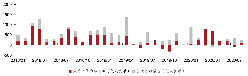 2020年8月,中資房企美元債發行金額為58.1億美元,相當于402.6億元人民幣,同比上升274.7%,環比下降26.1%;人民幣債發行金額為1198.7億人民幣,同比上升29.0%、環比上升28.8%。