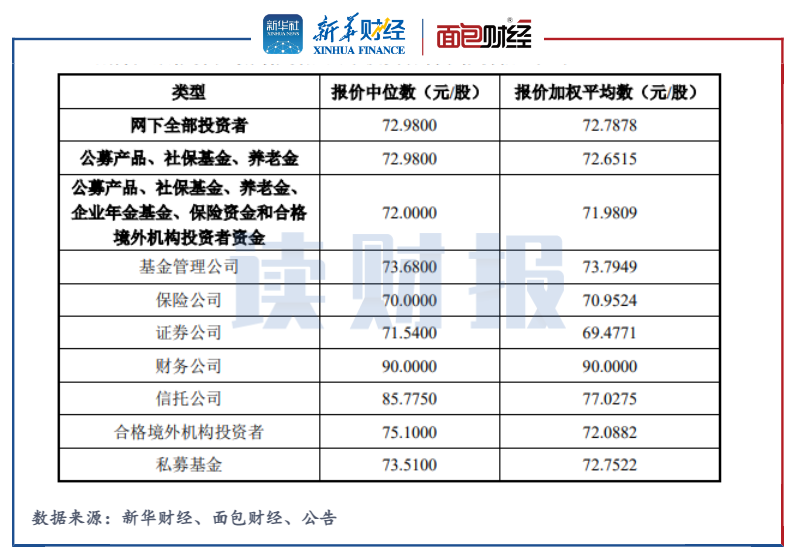 仁度生物在詢價期間共收到383家網下投資者管理的9958個配售對象的初步詢價報價信息,報價區間為7.50元/股-149.61元/股,擬申購數量總和為268.02億股。在剔除無效、高價報價后,入圍網下投資者的報價加權平均數為72.7878元/股,基金管理公司的加權平均數為73.7949元/股。