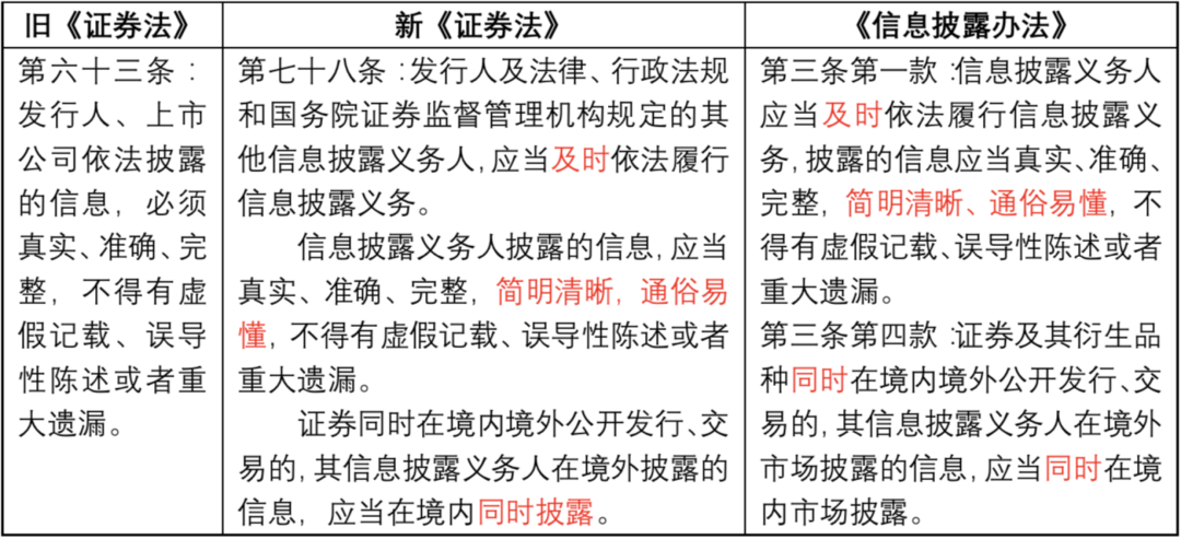 新《證券法》及《信息披露辦法》在舊《證券法》“真實(shí)、準(zhǔn)確、完整”信披基本要求基礎(chǔ)之上,新增了“及時(shí)、簡(jiǎn)明清晰、通俗易懂、同步”等信披的基本要求。具體而言: