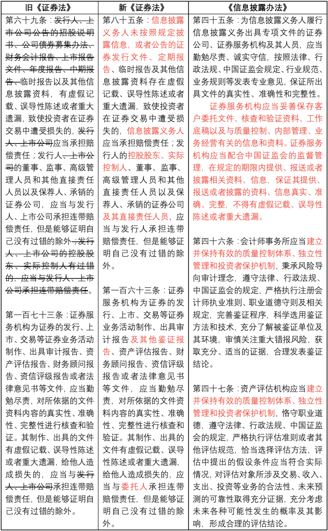 鑒于證券服務(wù)機(jī)構(gòu)作為證券市場(chǎng)的“看門(mén)人”,其對(duì)保障信息披露真實(shí)準(zhǔn)確完整等起著至關(guān)重要作用。新《證券法》也進(jìn)一步強(qiáng)加了證券服務(wù)機(jī)構(gòu)的“保障”作用,如第七十九條新增了公司年度財(cái)務(wù)會(huì)計(jì)報(bào)告應(yīng)當(dāng)經(jīng)會(huì)計(jì)師事務(wù)所審計(jì)的強(qiáng)制性要求。《信息披露辦法》也進(jìn)一步強(qiáng)化了證券服務(wù)機(jī)構(gòu)的“看門(mén)人”責(zé)任,明確證券服務(wù)機(jī)構(gòu)等應(yīng)當(dāng)依法發(fā)表專(zhuān)業(yè)意見(jiàn)、保存工作底稿、配合證監(jiān)會(huì)調(diào)查、建立質(zhì)量控制體系和投資者保護(hù)機(jī)制等。