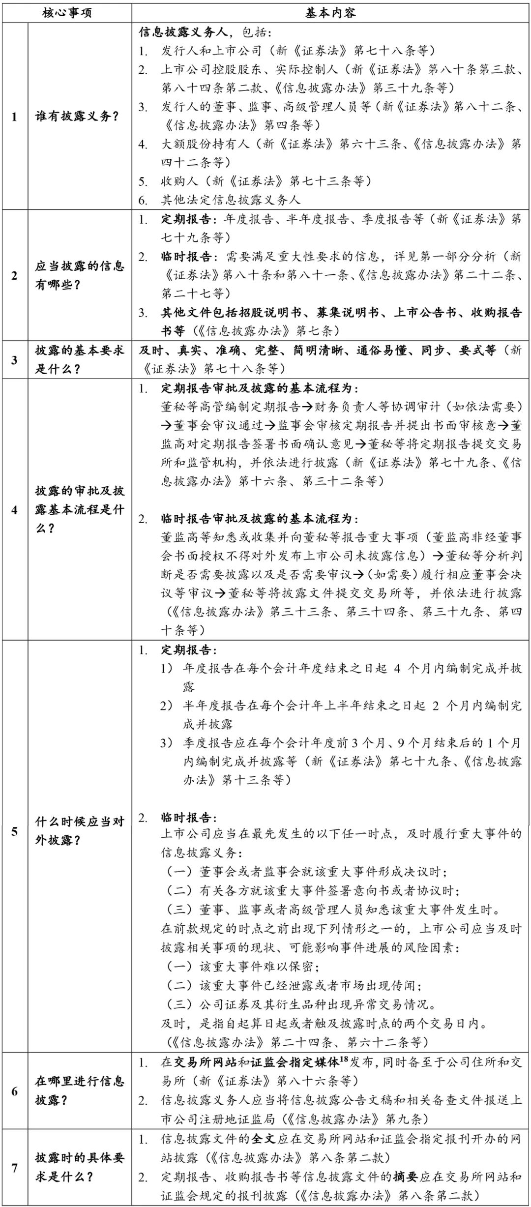 根據(jù)新《證券法》、《信息披露辦法》、交易所相關(guān)規(guī)則等規(guī)定,就信息披露的義務(wù)主體、應(yīng)披露的信息、披露基本要求、披露基本流程、披露時(shí)間點(diǎn)等,簡(jiǎn)要?dú)w納如下: