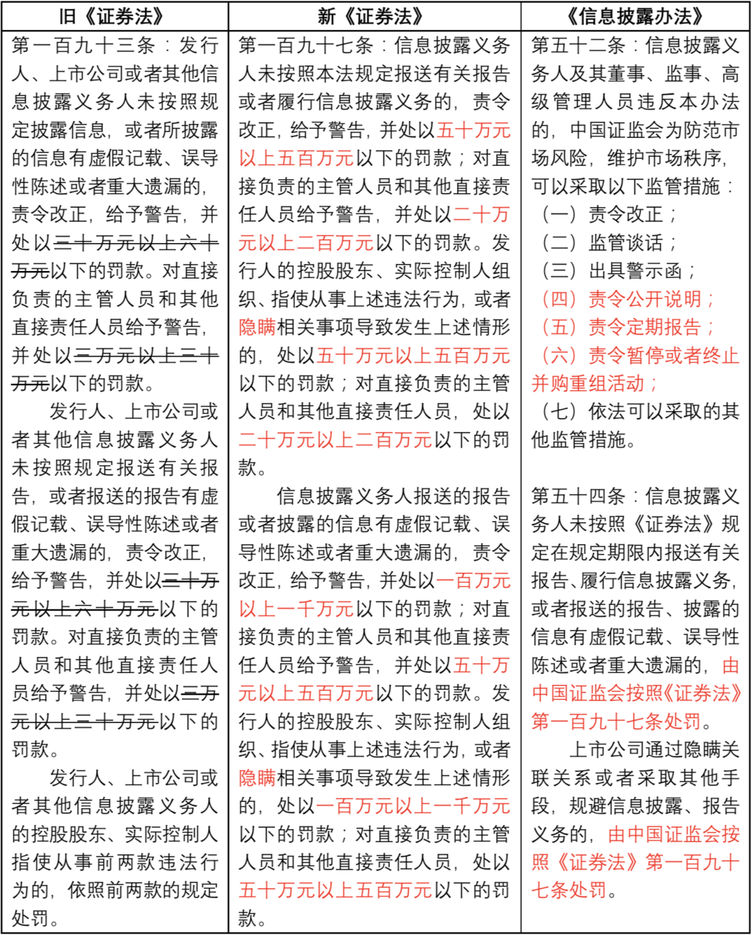 第二,顯著提高了行政處罰金額。對(duì)于未按規(guī)定報(bào)送和披露情形,信息披露義務(wù)人的罰款從30-60萬(wàn)元提升到50-500萬(wàn)元,直接負(fù)責(zé)的主管人員和其他直接責(zé)任人員的罰款從3-30萬(wàn)元提升到20-200萬(wàn)元;對(duì)于報(bào)送和披露存在信披違法情形,信息披露義務(wù)人的罰款從30-60萬(wàn)元提升到100-1000萬(wàn)元,直接負(fù)責(zé)的主管人員和其他直接責(zé)任人員的罰款從3-30萬(wàn)元提升到50-500萬(wàn)元。由此可知,新規(guī)顯著提高了信披違法人員的違法成本。