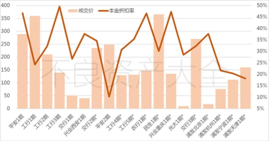 這其中還包括一期迷你標的(本金余額48萬元)。雖然不是已成交19期中體量最小的標的,但就如同迷你街鋪單價高一樣,浦發北京這個標的本金折扣率是四個標的里最高的。該標的最終被一家金融資產管理公司收入囊中,成為其對該市場的一次小小的試探。