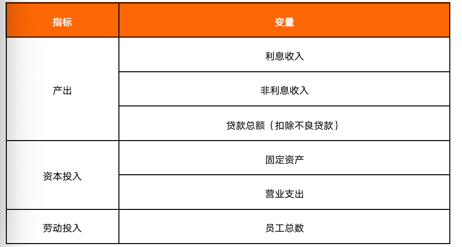 在測算銀行生產(chǎn)效率時,比較經(jīng)典的測算方法是數(shù)據(jù)包絡(luò)法(DEA法),該方法不對前沿生產(chǎn)函數(shù)中的具體參數(shù)形式進行估計,同時需要滿足多種投入和多種產(chǎn)出要素的條件,其測算的生產(chǎn)效率介于0到1之間。借鑒現(xiàn)有文獻指標選取的方法,本報告使用的指標情況如下表。本報告中各銀行的指標數(shù)據(jù)均來源于wind數(shù)據(jù)庫。