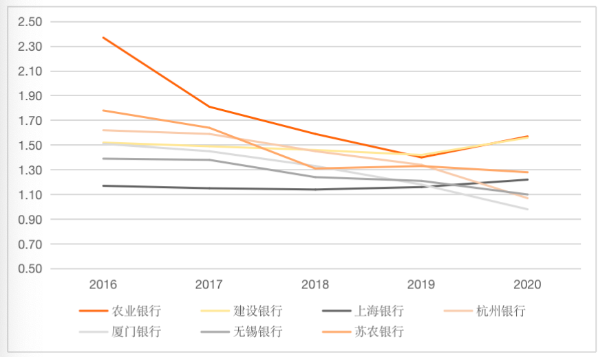 商業(yè)銀行的不良貸款率體現(xiàn)了銀行的貸款質(zhì)量,也在一定程度上能夠體現(xiàn)銀行搜尋優(yōu)質(zhì)客戶的能力。上海銀行的不良貸款率近5年穩(wěn)定在1.10%~1.25%之間,2020年其不良貸款率為1.22%。農(nóng)業(yè)銀行和建設(shè)銀行在2020年的不良貸款率相差不大,分別為1.57%、1.56%。杭州銀行、廈門銀行、無錫銀行和蘇農(nóng)銀行的不良貸款率近幾年呈現(xiàn)出不斷下降的趨勢。2020年,廈門銀行的不良短款率最低,為0.98%。