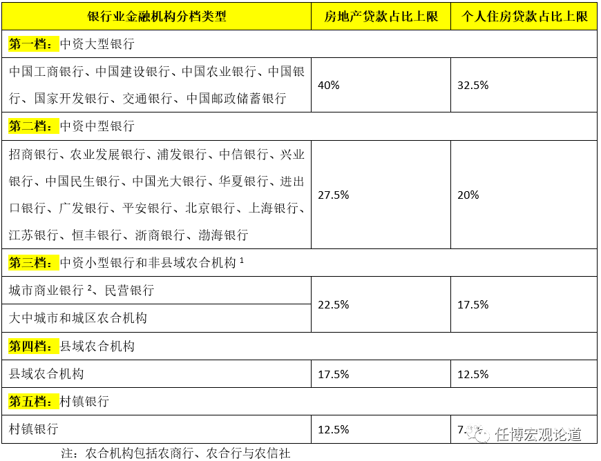 (六)322號文僅提及個人住房貸款和全部房地產(chǎn)貸款,同時從比例設(shè)置來看,第一檔(國有行)、第二檔(包括3家城商行的中型銀行)、第三檔的對公端房地產(chǎn)貸款占比上限分別應(yīng)不低于7.50%、7.50%和5%,第四檔與第五檔的對公端房地產(chǎn)貸款占比上限亦分別應(yīng)不低于5%。因此我們大致可以這樣理解,322號文同時對個人住房貸款和對公端房地產(chǎn)業(yè)貸款比例提出了具體約束要求。