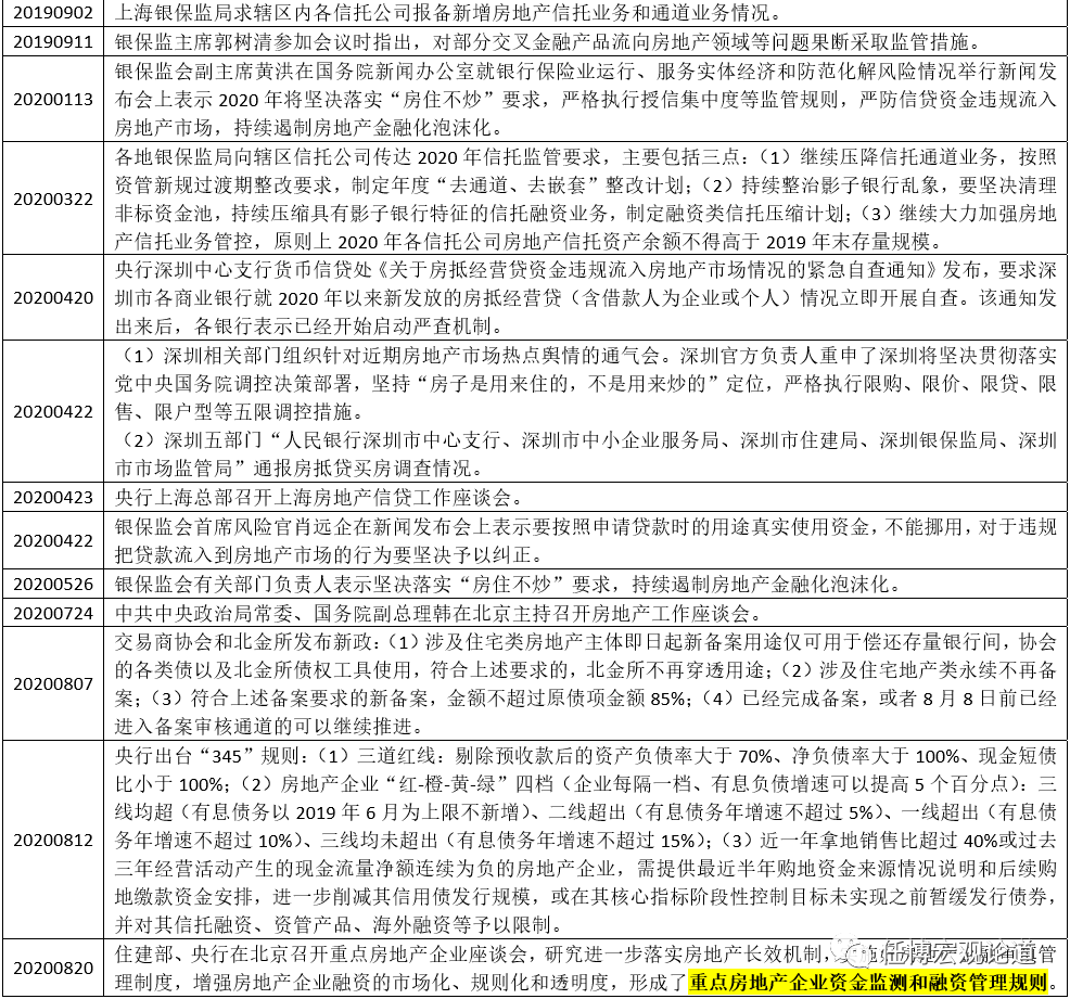 2、2019年政策層面對房地產(chǎn)業(yè)務(wù)的嚴(yán)監(jiān)管始于中美貿(mào)易摩擦形勢開始明顯惡化(2019年5月5日)、包商銀行被接管以及貨幣政策層面再次放松之后,而2019年6月13日銀保監(jiān)會主席郭樹清在陸家嘴論壇上提示房地產(chǎn)金融業(yè)務(wù)風(fēng)險這一事件則正式拉開了房地產(chǎn)行業(yè)嚴(yán)監(jiān)管的大幕,隨后整個7月份的房地產(chǎn)政策監(jiān)管信息便比較集中,主要體現(xiàn)在房地產(chǎn)信托融資、房企境外發(fā)債等等。