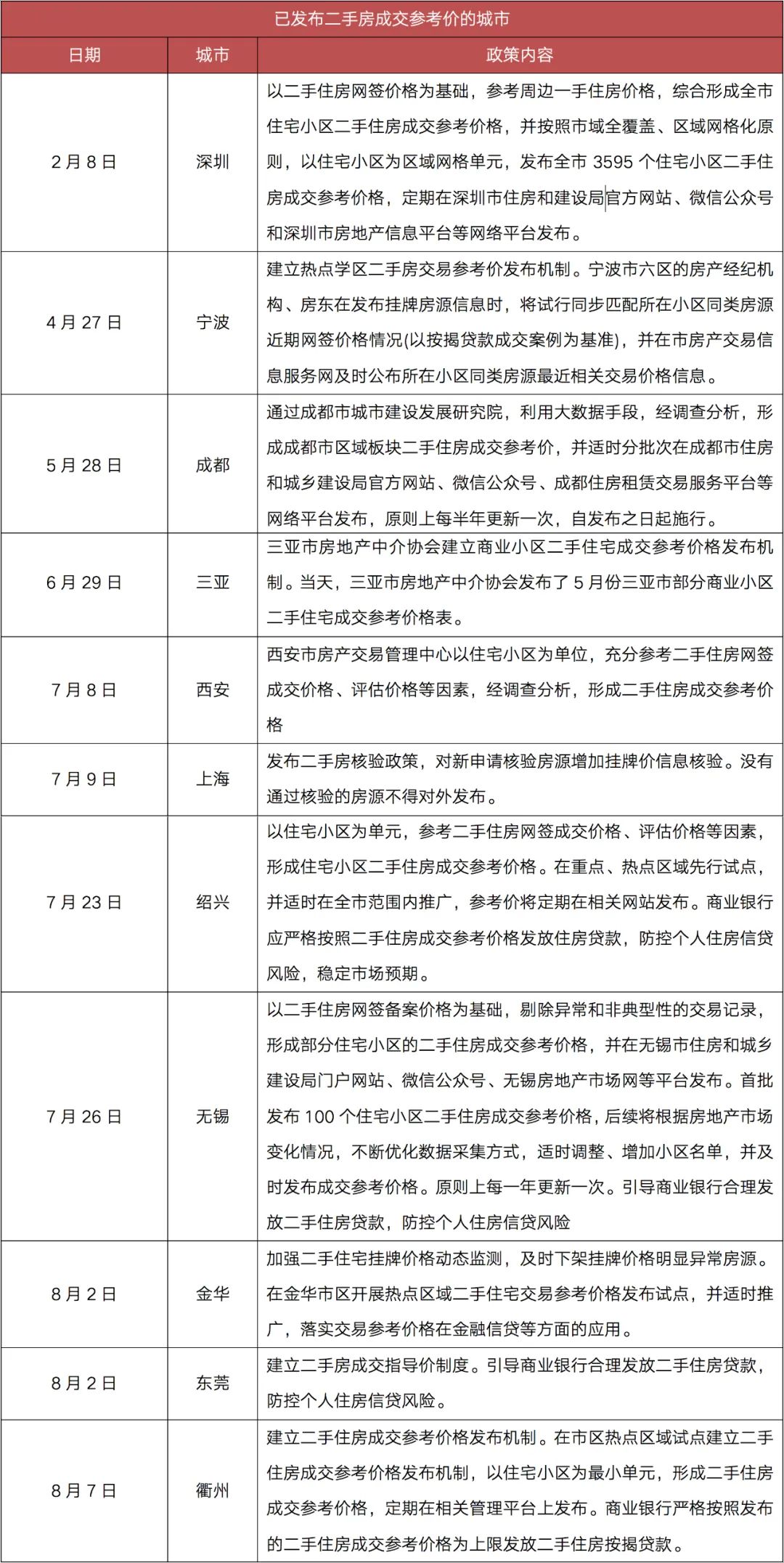 表:已發布二手房成交參考價的城市