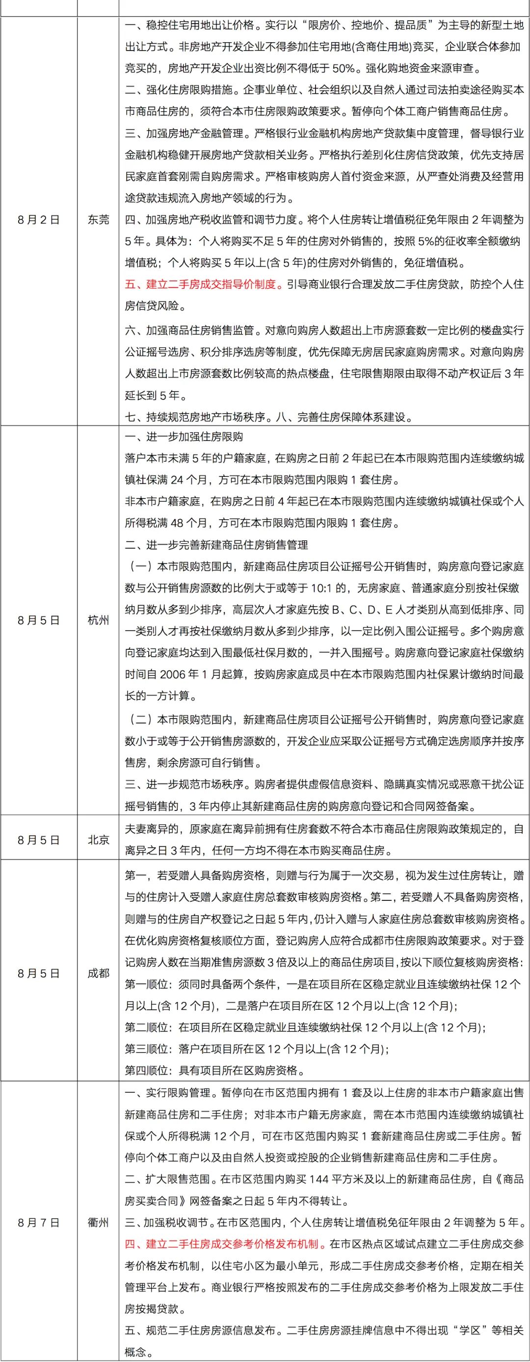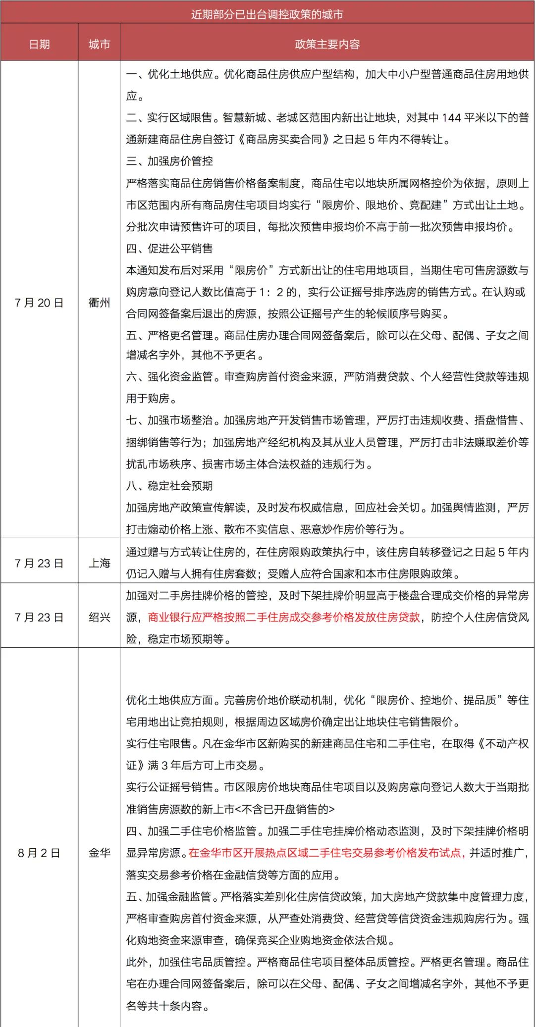 自7月23日住建部8部門發文以來,跟進升級調控的城市中,紹興、金華、東莞、衢州明確了建立二手住房成交參考價格發布機制,商業銀行嚴格按照發布的二手住房成交參考價格為上限發放二手住房按揭貸款。