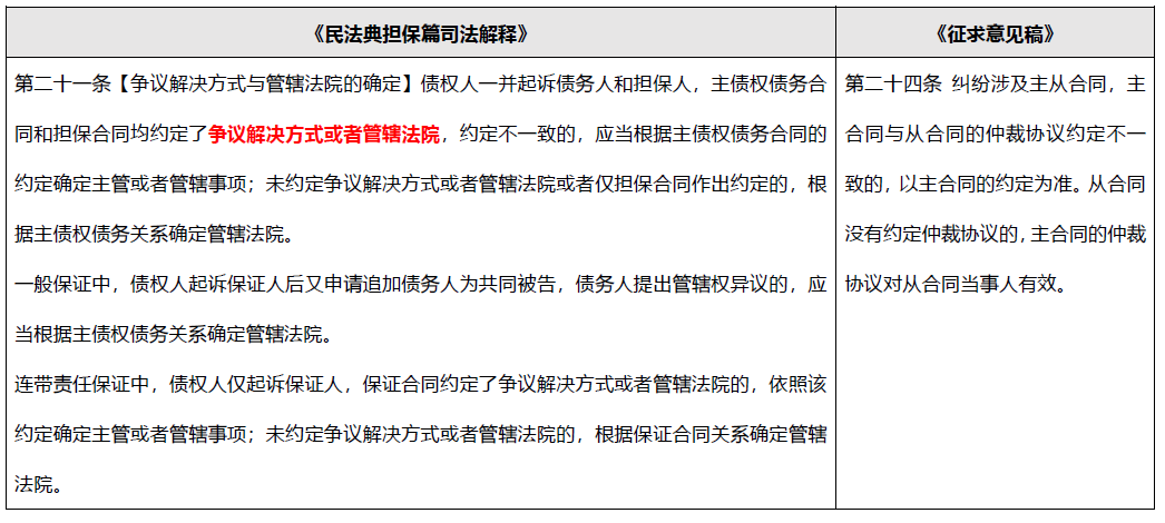 “從隨主走”是從《擔(dān)保法》時(shí)期就開始的司法實(shí)踐, 但該等司法實(shí)踐當(dāng)初僅局限于法院訴訟的管轄條款, 并不及于仲裁條款, 導(dǎo)致主從合同約定的爭(zhēng)議解決方式不同、約定的仲裁機(jī)構(gòu)不一致的情況下, 債權(quán)人很可能需要經(jīng)多個(gè)程序, 才能實(shí)現(xiàn)其債權(quán)及其擔(dān)保物權(quán), 在浪費(fèi)大量司法資源的同時(shí), 也使得債權(quán)人產(chǎn)生了很大的訴訟費(fèi)、仲裁費(fèi)支出。進(jìn)入《民法典》時(shí)代后, 最高院頒布《最高人民法院關(guān)于適用<中華人民共和國(guó)民法典>擔(dān)保部分的解釋》(“《民法典擔(dān)保篇司法解釋》”)將“從隨主走”的適用范圍拓寬至“爭(zhēng)議解決方式或者管轄法院”, 但是我們仔細(xì)比較《民法典擔(dān)保篇司法解釋》第二十一條和《征求意見稿》第二十四條的規(guī)定卻發(fā)現(xiàn)兩者存在一定沖突。
