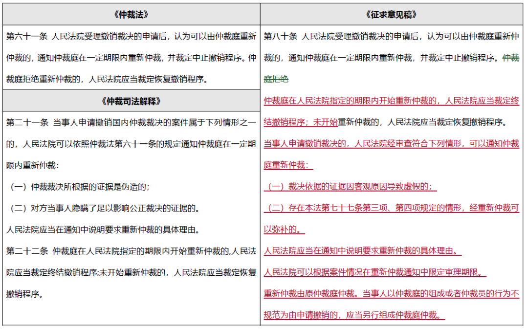 除撤銷仲裁裁決事項(xiàng)外, 《征求意見稿》對(duì)撤銷仲裁裁決案件中法院指定仲裁庭重新仲裁的情況進(jìn)行了明確的規(guī)定。