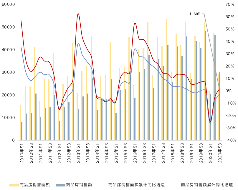 從行業(yè)數(shù)據(jù)來看,2020年第三季度,全國新房銷售恢復(fù)顯著提速,至8月商品房銷售額累計增速回正,單月規(guī)模創(chuàng)正常月份(除6、12月外)新高。據(jù)國家統(tǒng)計局?jǐn)?shù)據(jù)顯示:前8月全國商品房銷售面積9.8億平方米,同比下降3.3%,降幅比上半年收窄5.1個百分點。商品房銷售額96943億元,增長1.6%,其中住宅銷售額增長4.1%。