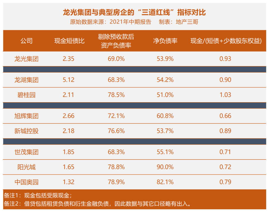 即便扣除受限現金,龍光集團、世茂集團是少數幾家“三條紅線”全部達標的民營房企。
