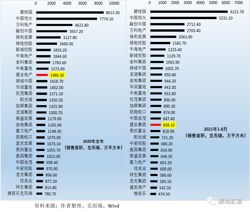 但由于不同地區的地價與房價差異明顯,因此這種排名似乎并不公允。若以銷售面積來看,則發現建業集團則分別位居中國地產企業第11位(2020年)和第19位(2021年1-8月)。因此,建業集團的市場地位雖然不足以和恒大相提并論,但終歸也算是位于市場前列。