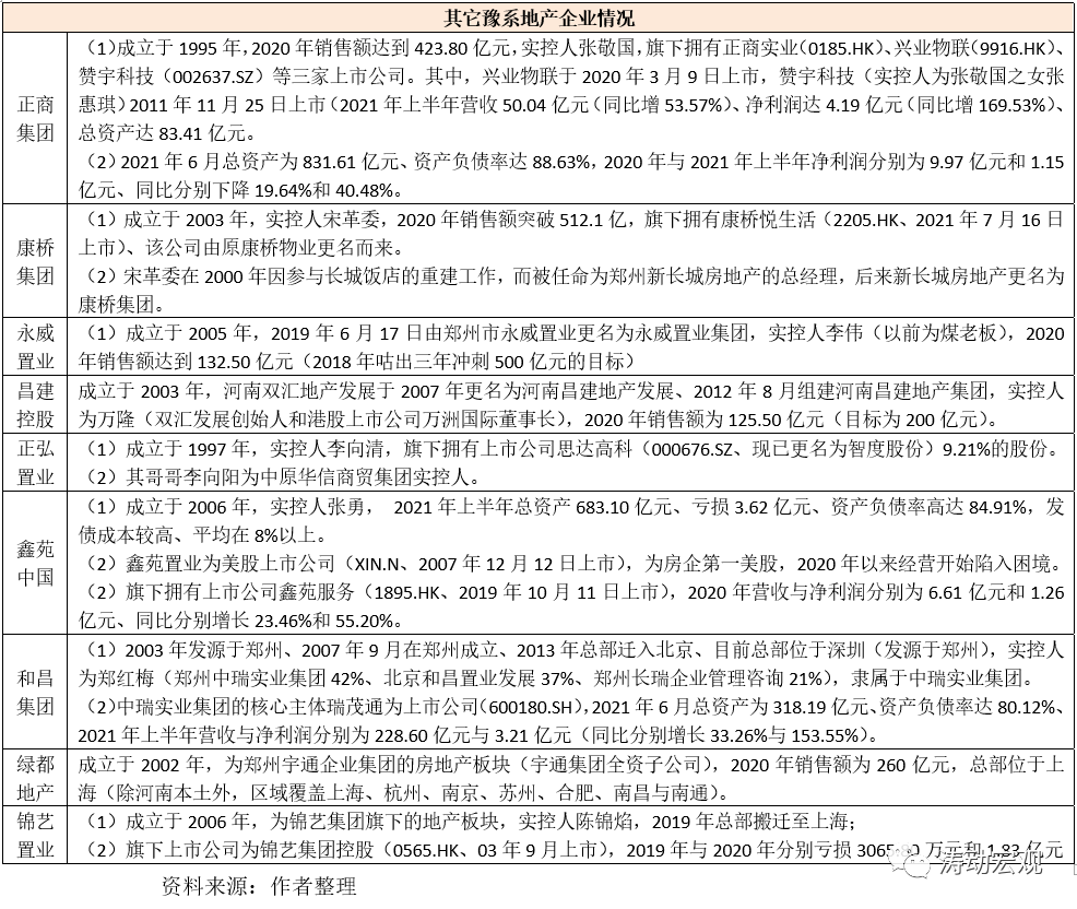 (二)在河南本地金融生態環境遭到永煤事件沖擊以及地產政策收緊之后,豫系地產企業的流動性壓力面臨空前挑戰,這一方面與豫系地產企業的高杠桿率有關(如建業的資產負債率高達92.10%、正商的資產負債高達88.63%、鑫苑的資產負債率高達84.91%等),另一方面也與疫情、政策等突發事件有關。基于此,我們認為豫系地產企業正處于危急關頭,面臨的生存壓力不小。例如,鑫苑中國今年上半年虧損了3.62億元、錦藝置業2020年虧損了1.83億元。
