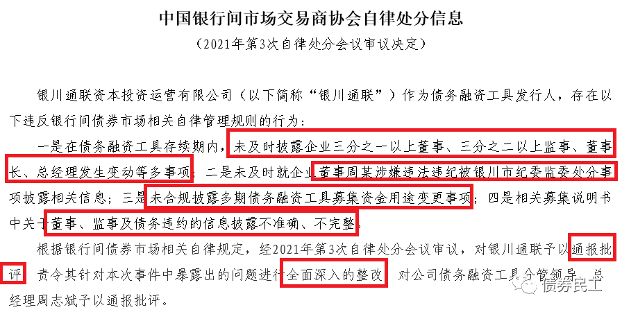 根據銀行間市場交易商協會網站的公開信息,銀川通聯資本投資運營有限公司(以下簡稱“銀川通聯資本”)因為未及時披露董監高變動情況、董事被處分情況、募集資金用途變更情況等,被交易商協會處以通報批評的自律處分。