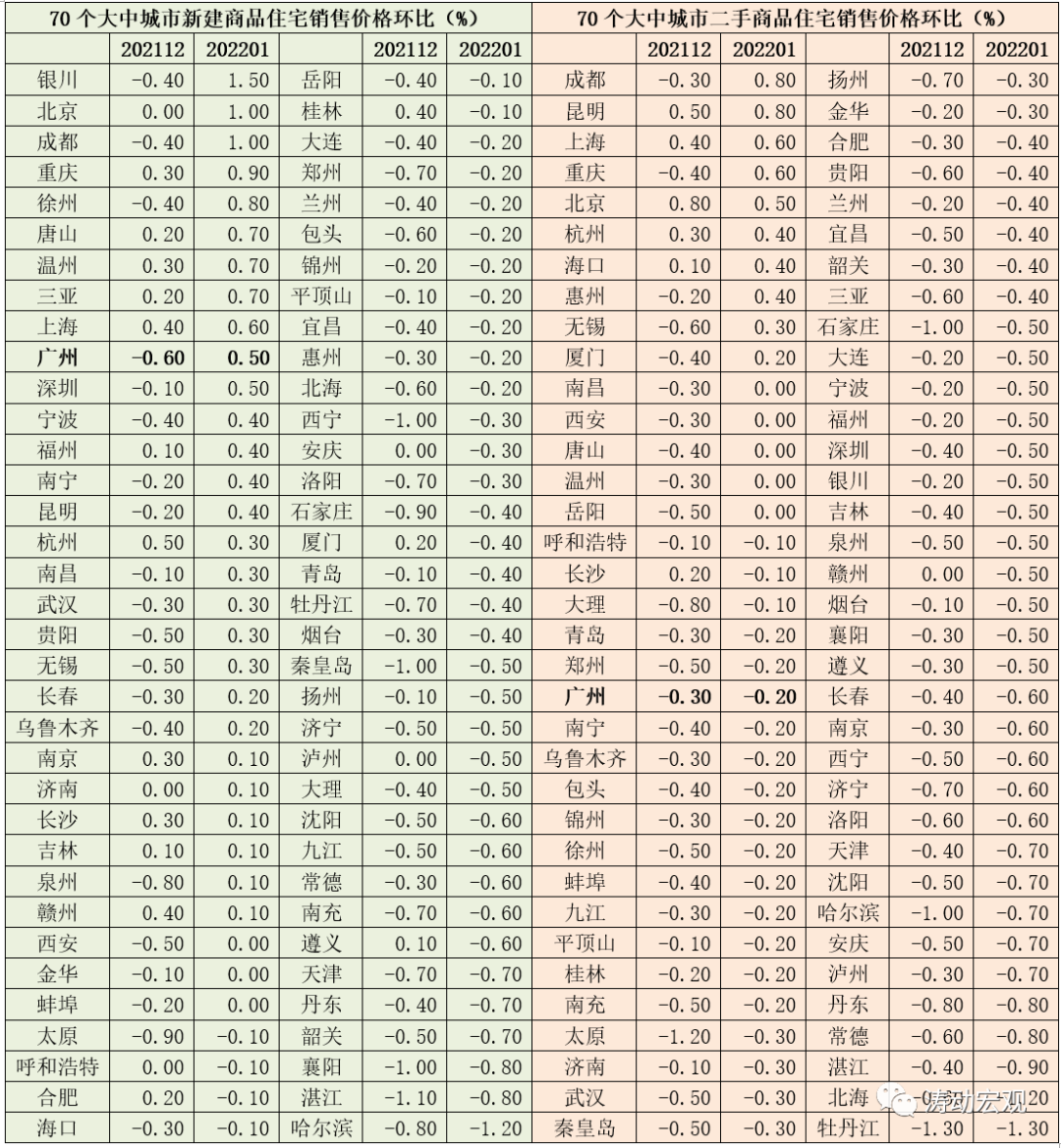 二、如果將廣州地區(qū)下調(diào)房貸利率和今年國(guó)家統(tǒng)計(jì)局發(fā)布的一組數(shù)據(jù)結(jié)合在一起理解則會(huì)更有意思。2022年2月21日,國(guó)家統(tǒng)計(jì)局發(fā)布2022年1月份70個(gè)大中城市商品住宅銷(xiāo)售價(jià)格變動(dòng)情況,具體數(shù)據(jù)如下: