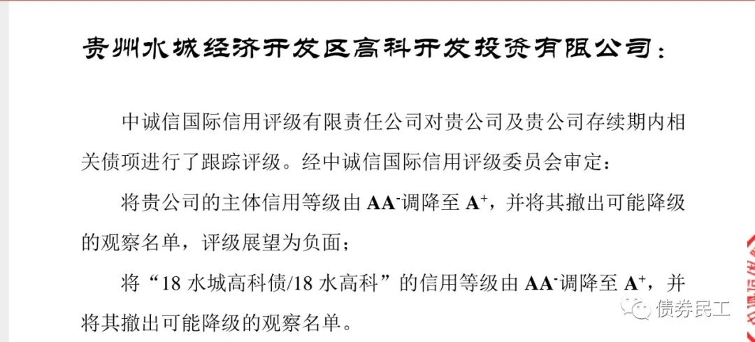 根據(jù)中誠信國際2021年6月28日出具的最新跟蹤評級報告,貴州水城經投的主體信用評級由AA-下調至A+。