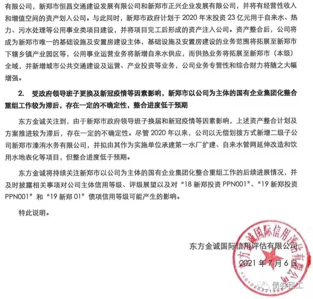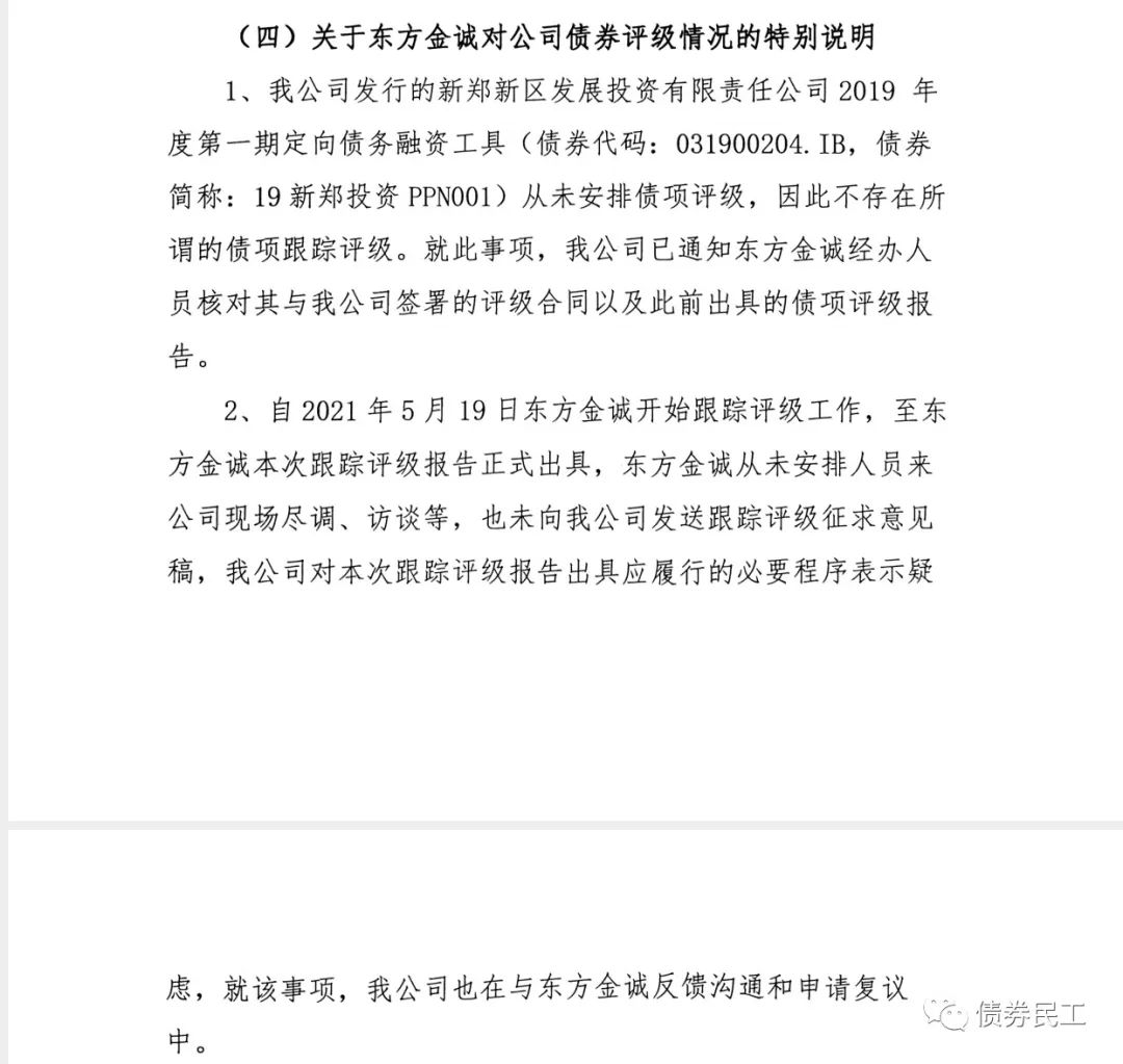 2021年6月29日,東方金誠的跟蹤評級報告評定新鄭新區(qū)發(fā)展投資有限責任公司(以下簡稱“新鄭投資”)發(fā)行的“18新鄭投資PPN001”和“19新鄭投資PPN001”的主體評級為AA+,評級展望由穩(wěn)定調整為負面。新鄭投資在2021年7月2日發(fā)布了《關于東方金誠國際信用評估有限公司調整公司評級展望的公告》,明確申明了兩個特別說明:一是新鄭投資認為 “19新鄭投資PPN001”未做債項評級安排;二是新鄭投資認為東方金誠跟蹤評級未進行現(xiàn)場盡調訪談、也未征求公司意見,評級報告出具未履行必要流程,正在申請復議中。
