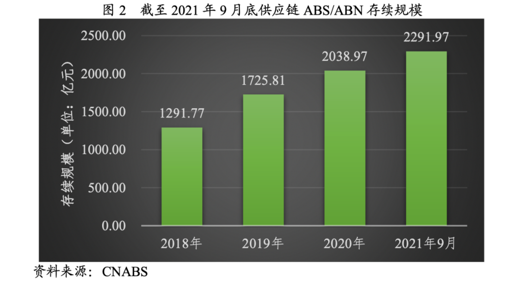 供應鏈融資以房企應付賬款為基礎資產,采用“1+N”反向保理模式,以單一核心企業及其下屬公司為債務人的供應鏈資產證券化產品在解決上游供應商資金回籠。近三年,房企供應鏈融資存續規模呈逐年遞增態勢。截至2021年9月底,房企供應鏈存續規模2291.97億元,其中前三大房企(萬科企業股份有限公司、碧桂園地產集團有限公司和保利發展控股集團股份有限公司)存續金額[4]分別為685.75億元、162.19億元和160.48億元。