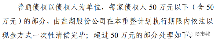 這其實(shí)是對(duì)散戶投資人剛兌的意思,中國(guó)債券市場(chǎng)延續(xù)了銀行存款保險(xiǎn)制度里面對(duì)50w元存款全額保障的思路,目前披露的破產(chǎn)重整方案都延續(xù)了50w債權(quán)剛兌的做法。這也是散戶參與高收益?zhèn)袌?chǎng)最大的優(yōu)勢(shì),中國(guó)債券市場(chǎng)除了城投信仰,還有散戶信仰。