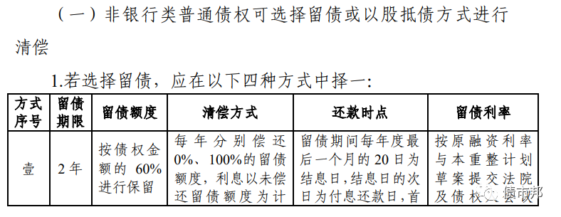 鹽湖的非銀機(jī)構(gòu)債權(quán)人,既可以選擇債轉(zhuǎn)股,也可以選擇留債現(xiàn)金清償,其中現(xiàn)金清償可以選擇5年拿回100元的本金,4年拿回80%的本金,3年拿回68%的本金或是2年拿回60元的本金,機(jī)構(gòu)可以根據(jù)自己的持倉(cāng)成本和負(fù)債穩(wěn)定性自主選擇現(xiàn)金償債方案。