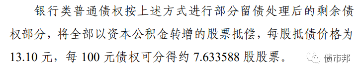 根據(jù)破產(chǎn)重整方案,商業(yè)銀行只能獲得非銀機(jī)構(gòu)放棄的債權(quán)的現(xiàn)金清償權(quán)利,也就是前文所述的11.8億元,對(duì)于商業(yè)銀行持有的幾百億債券而言是杯水車薪。所以絕大多數(shù)商業(yè)銀行債權(quán)都只能被迫債轉(zhuǎn)股。