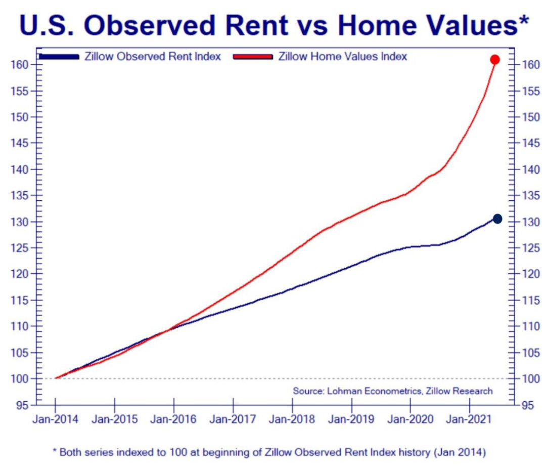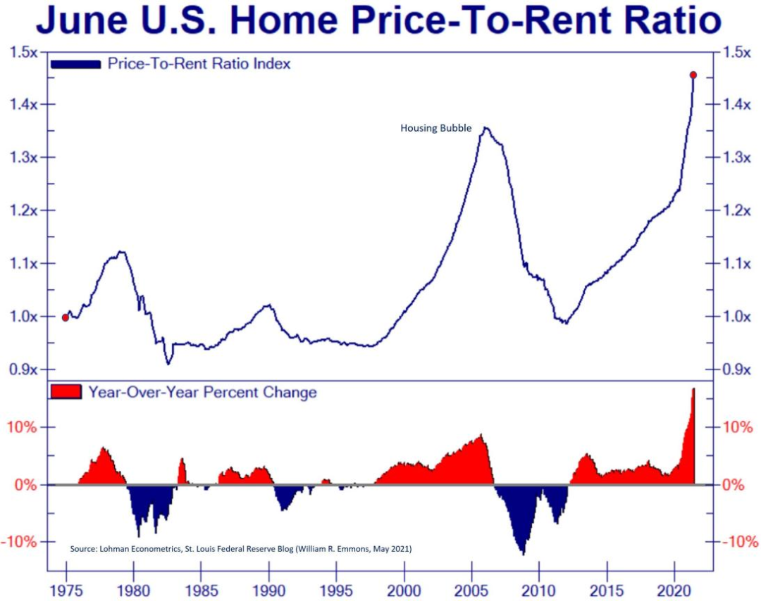 特別是高地價(jià)問(wèn)題突出,也是困擾美國(guó)公寓運(yùn)營(yíng)商的難題。上圖反映了2014年以來(lái)Zillow(全美最大的在線房源網(wǎng)絡(luò))房?jī)r(jià)與租金指數(shù)的分歧,即房?jī)r(jià)上漲快過(guò)房租上漲,表明出租型公寓也面臨客觀上租金回報(bào)率的降低。下圖則反映了房?jī)r(jià)租金比的趨勢(shì),經(jīng)過(guò)2012年以來(lái)持續(xù)的房地產(chǎn)牛市,特別是2020年以來(lái)的房?jī)r(jià)上漲,房?jī)r(jià)租金比刷新次貸危機(jī)的峰值,進(jìn)一步顯示租金回報(bào)降低的壓力。