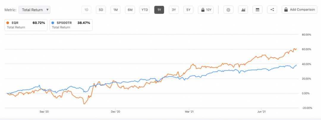 尤其今年5月,美國(guó)新房建設(shè)成本同比增長(zhǎng)11%,這是自1980年以來(lái)最高值(如上圖所示)。過(guò)去40年大部分時(shí)間美國(guó)建筑成本都在上升,加上受到通脹回升及通脹交易的雙重提振,美股市場(chǎng)REITs的平均回報(bào)率超過(guò)25%,其中公寓REITs更是超過(guò)35%,大幅跑贏行業(yè)及美股主要股指,同類資產(chǎn)中表現(xiàn)僅次于私人倉(cāng)儲(chǔ)REITs。但從規(guī)模而言,20只公寓REITs總市值超過(guò)2100億美元,是美股市場(chǎng)REITs的絕對(duì)權(quán)重之一,有如此回報(bào)彈性也著實(shí)驚人。