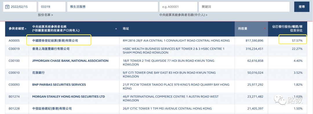 因為雅生活是H股結構公司,大股東通過境內公司持有雅生活股份。顯示在港交所中央結算系統中,大股東的賬戶由中證登持有。▼