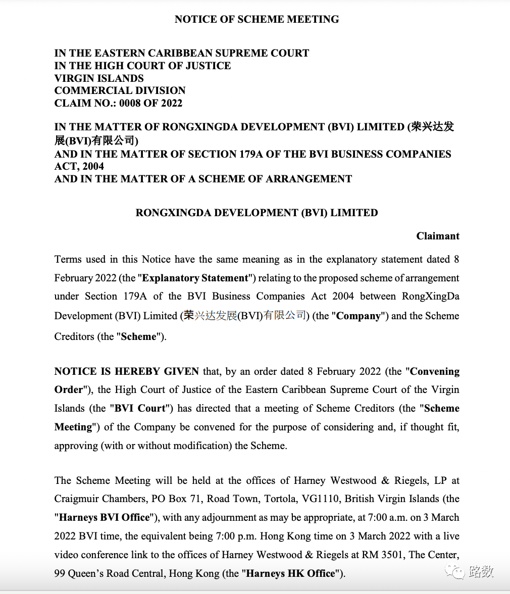 榮盛發展在1月向BVI法院遞交了協議安排的申請,并于2月8日獲批。香港時間3月3日傍晚7點,將進行協議安排會議。▼