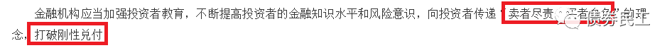 目前監管機構對非標產品剛性兌付問題指導意見最明確的文件是人民銀行、銀保監會、證監會和外匯局于2018年聯合印發的《關于規范金融機構資產管理業務的指導意見》(銀發[2018]106號)(以下簡稱“指導意見”)。指導意見明確提出了要打破剛性兌付。需要注意的是,指導意見中的剛性兌付的內涵實際上是包括兩個方面的內容:一是賣者盡責,二是買者自負。也就是說金融機構需要放棄剛性兌付的包袱,而投資者則需要接受投資所帶來的潛在風險。