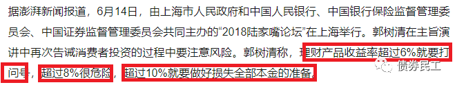 單純的從非標市場來看,投資者是市場上的稀缺資源,是各類金融機構爭取的優質客戶。從現有的公開信息來看,金融機構是實際上很難履行投資者教育相關工作,讓投資者充分認識到金融產品可能存在的風險和問題。因此,投資者對于非標產品“買者自負”的可能并未達到監管的要求。這里我們再重溫一下郭主席的講話“理財產品收益率超過6%就要打問號,超過8%很危險,超過10%就要做好損失全部本金的準備”。