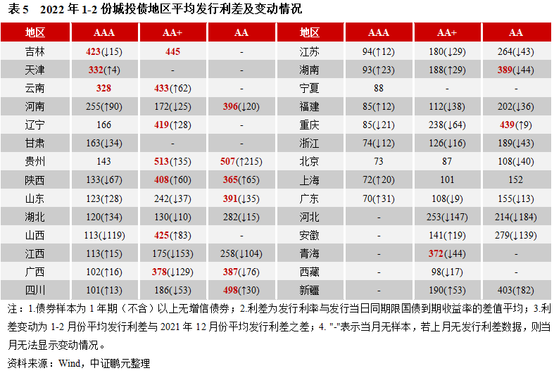 6. 1-2月份城投債發行利率全線下行,除短期限AAA級利差擴大外,其余利差均收窄