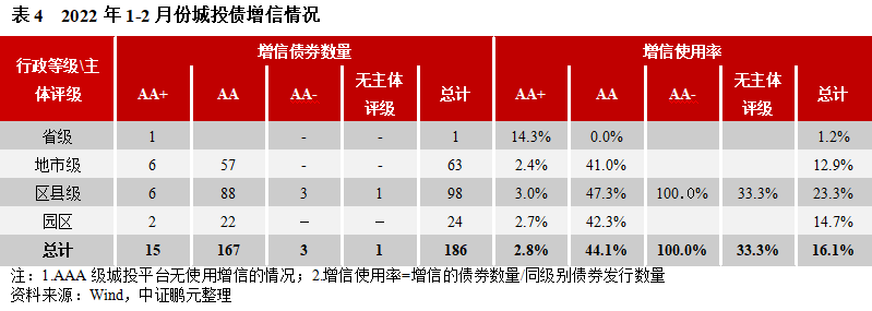 2022年1-2月份,采取增信的城投債共186只,總體增信使用率16.1%,較去年12月份下降8.4個百分點。從主體評級級別和行政等級來看,采取增信的城投主體主要為AA級平臺,采取增信的債券共167只,增信使用率44.1%%,但較去年12月份下降了9.2個百分點。AA級平臺中,各行政級別的城投的增信使用率均較高。其中,地市級城投采用增信的債券57只,增信使用率41.0%,較去年12月份上升2.4個百分點,區縣級城投采用增信的債券88只,增信使用率47.3%,較去年12月份下降了17.7個百分點;園區城投采用增信的債券22只,增信使用率42.3%,較去年12月份下降了12.6個百分點。