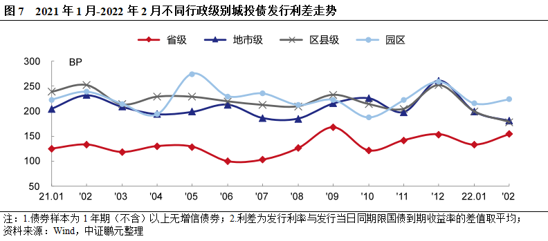 從各級別城投平臺平均發行利差來看,2022年1-2月份,省級和園區城投債在1月份發行利差收窄后在2月份有所回升,地市級和區縣級城投債的發行利差收窄,并處于近1年來相對降低的利差水平。具體來看,省級、地市級、區縣級以及園區城投在1-2月份的平均利差分別為138BP、195BP、195BP、218BP,與去年12月份相比分別收窄16BP、67 BP、58BP、40BP。